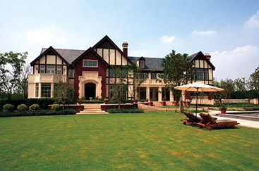 英式建筑的主要特征为双坡陡屋面、深檐口、外露木构架、砖砌底脚等。屋面高低错落,色彩以青灰色为主,外墙材料多采用红砖,配以木饰,细密的窗户分格、精美的雕刻栏杆,体现出英式别墅考究、细腻的特质。